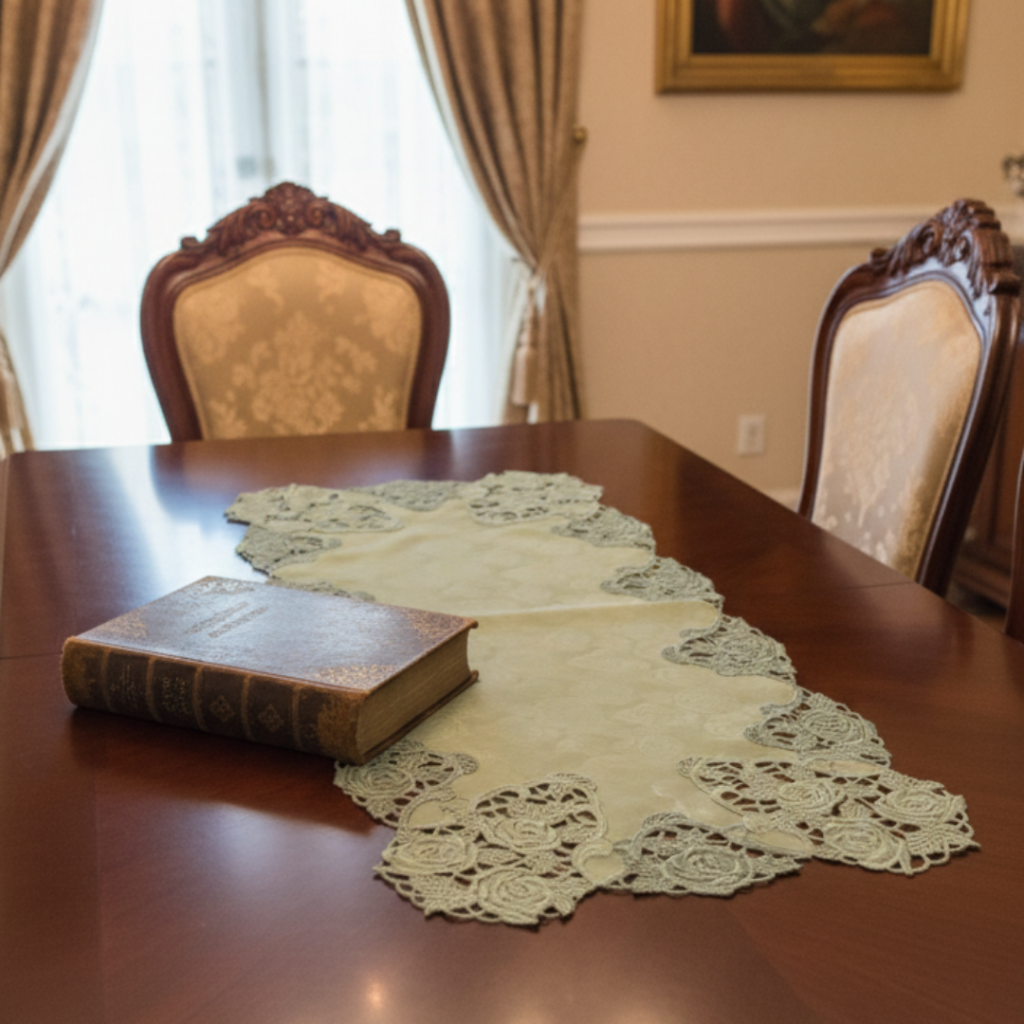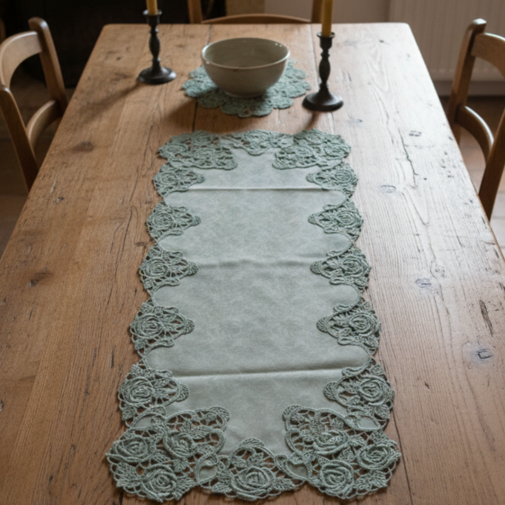 Camino De Mesa Verde Con Rosas Con Encaje 40X100Cm – Plauener Spitze