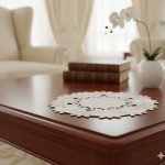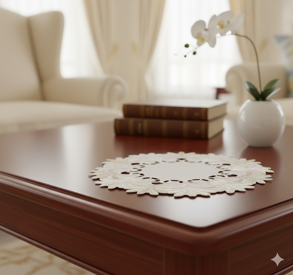 Preciosa carpeta circular con bordado floral en color dorado, estilo vintage. Confeccionado en 100% poliéster para mayor durabilidad. Ideal para decorar tu comedor, cocina o sala, su diseño versátil y atemporal añade elegancia y calidez a cualquier ocasión. Medidas: ⌀30cm.